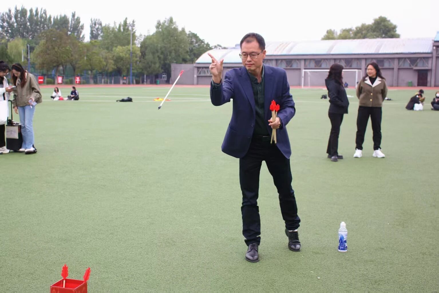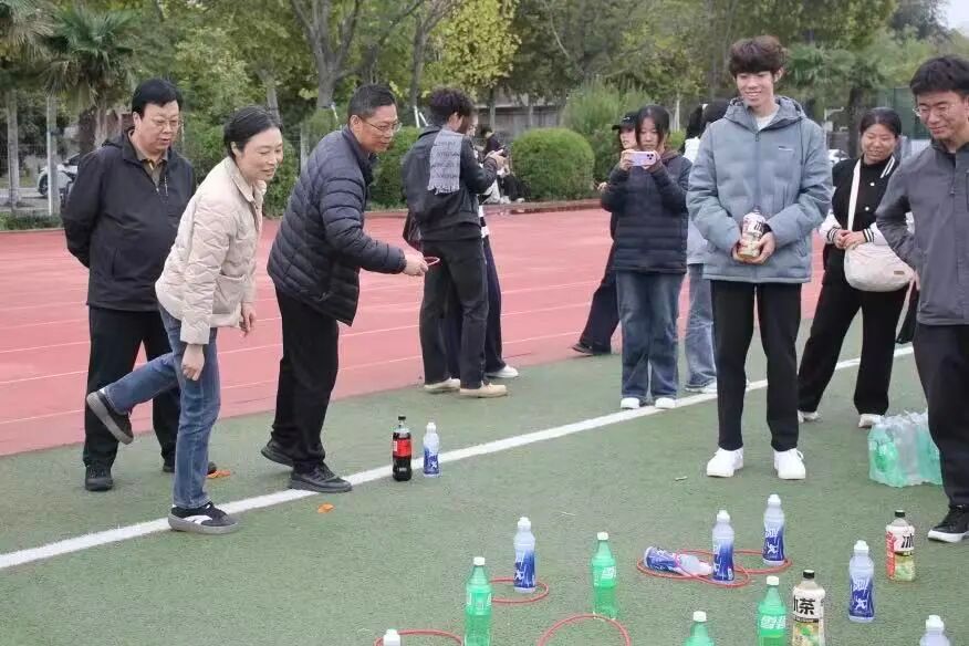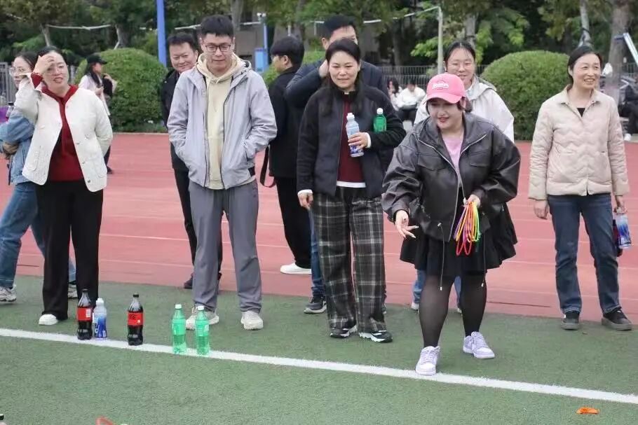 教师们也积极投身赛场,为运动会增添了更多欢乐与温情。投壶比赛中,老师们瞄准壶口投箭,每一次命中都引来学生阵阵喝彩;乒乓球绕桩时,有人稳稳端球顺利往返,也有人偶尔掉球笑着重来;套圈与丢沙包项目里,老师们重拾童年乐趣,与学生们的欢呼声交织在一起,师生间的距离在互动中悄然拉近。